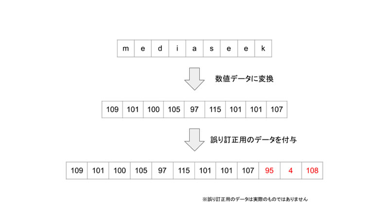 2)その数値データから誤り訂正用のデータを計算し、末尾に付与します。