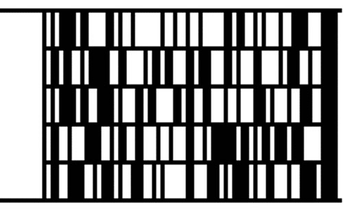 細かくいうと2次元コードには「スタック型」と「マトリックス型」があり、「データマトリックス」は後者、すなわち「マトリックス型」のコードになります。QRコードも「マトリックス型」です。その名のとおりマトリックス = 格子状に黒と白のセルを配置し、その組み合わせで情報を表すというものです。一方の「スタック型」は、1次元コード = バーコードをタテに1段、2段、3段…と積み上げた形になっています。スタック型については下図の「CODE49」サンプルコードをご覧ください。バーコードがタテに1段、2段、3段…と積み上がったような形状ですね。スタック = 積み上げの意味が分かっていただけると思います。