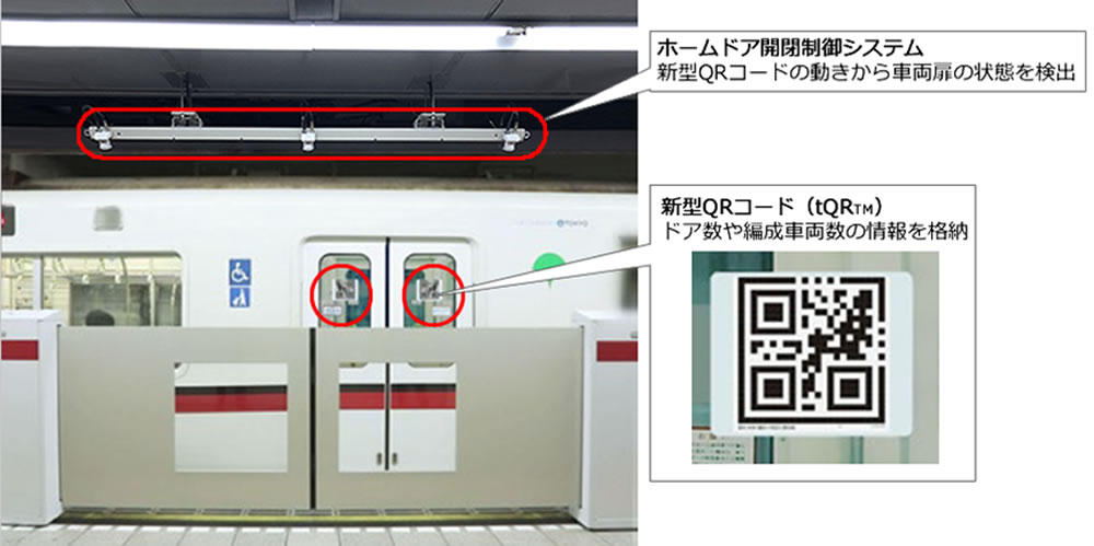 ドア数や編成車両数の情報を格納したtQR(R)が印刷されたラベルを車両の扉に貼ることで、駅ホームに設置されたスキャナがそれを読み取って車両扉の状態を検出します。すると、それと連動してホームドアが開閉するという仕組みです。メリットとしては、通信制御機器の代わりに新型QRコードと駅ホームのスキャナだけで済むのでコストが安価であること。車両の大規模改修が不要なので工期が短いこと。そして、車両扉の制御のみでホームドアの連動開閉が行えるので、車両扉とホームドアを別個に手動開閉するのに較べ乗務員の業務負荷を低減できることが挙げられます。