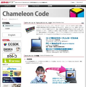 Chameleon Code(R)(以下、カメレオンコード)は最大8色を使用する2次元カラーコードです。4色の基本色(シアン・マゼンタ・イエロー・ブラック)と、同じく4色の追加色(グリーン・レッド・ブルー・オレンジ)を組み合わせたパターンでできており、例えば劣悪な環境下では色数を少なくして認識性を確保し、良好な環境下では逆に色数を足すことで格納できる情報量を増やすといったことが可能です。例えば行数3×色数4の場合は約7兆6255億とおりのパターンですが、これを1色増やして5色にするだけで、約1京8014兆パターンという膨大な情報量に対応できます。また有効期間および回数を設定できるので、1回限り利用可能なワンタイムカメレオンコードも作れます。用途例としては棚卸し・入出庫管理、出退勤管理、図書管理、構内安全運転検知システム、外国人観光客向け多言語案内など。