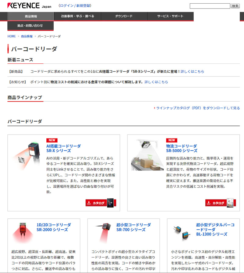 (株式会社キーエンス公式サイトのバーコードリーダ商品情報トップページ https://www.keyence.co.jp/products/barcode/ より)