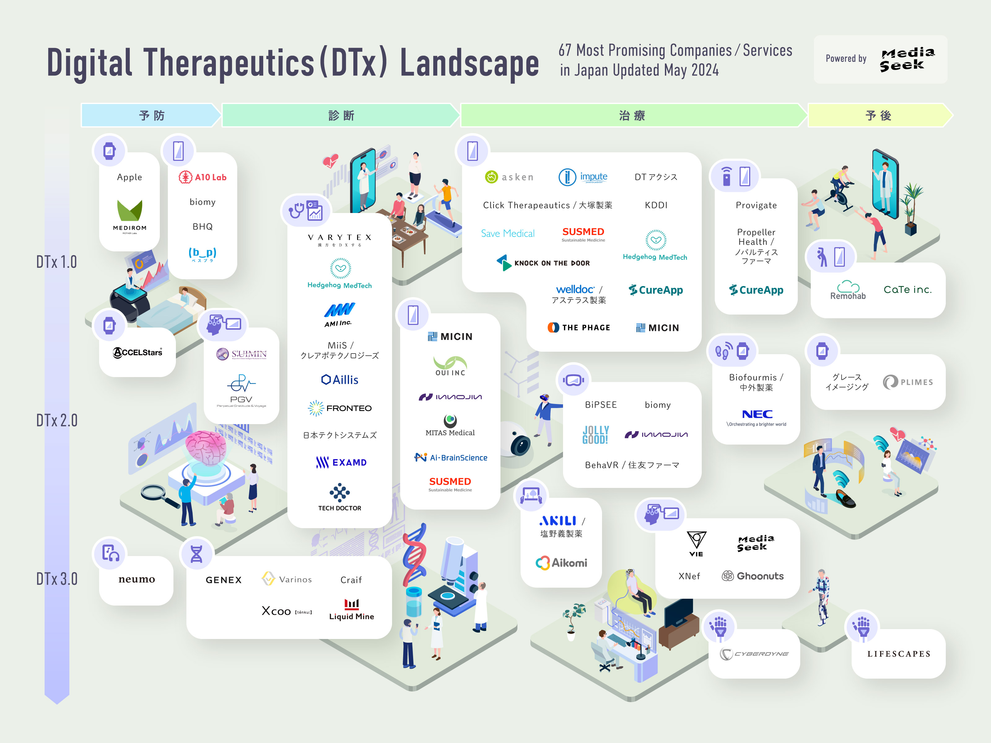 横軸を医療接点である「予防」、「診断」、「治療」、「予後」の4カテゴリ―で分類し、縦軸は技術の深まりや社会との関わりを「DTx1.0」、「DTx2.0」、「DTx3.0」のグラデーションで表現し、多様化するDTx技術をまとめました。