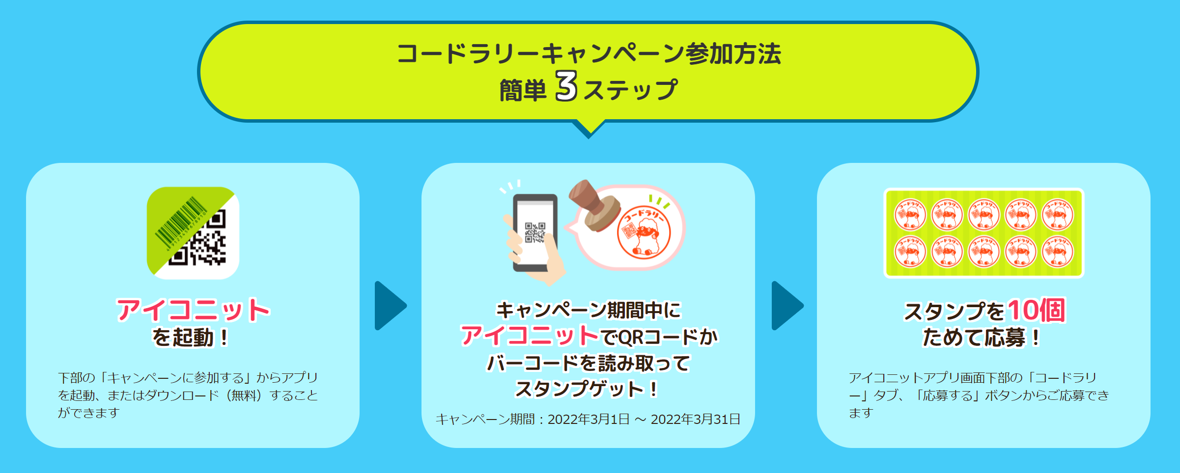 毎月実施している「コードラリー」キャンペーンを大幅にパワーアップ! Amazonギフト券5,000円分やNintendo Switchなどの豪華景品が計103名様に当たります。「アイコニット」でQRコードまたはバーコードを読み取ることでアプリ内にスタンプが貯まり、10個スタンプが貯まると応募できます。参加方法の詳細につきましては下記のキャンペーン特設ページよりご確認いただけます。奮ってご参加ください!