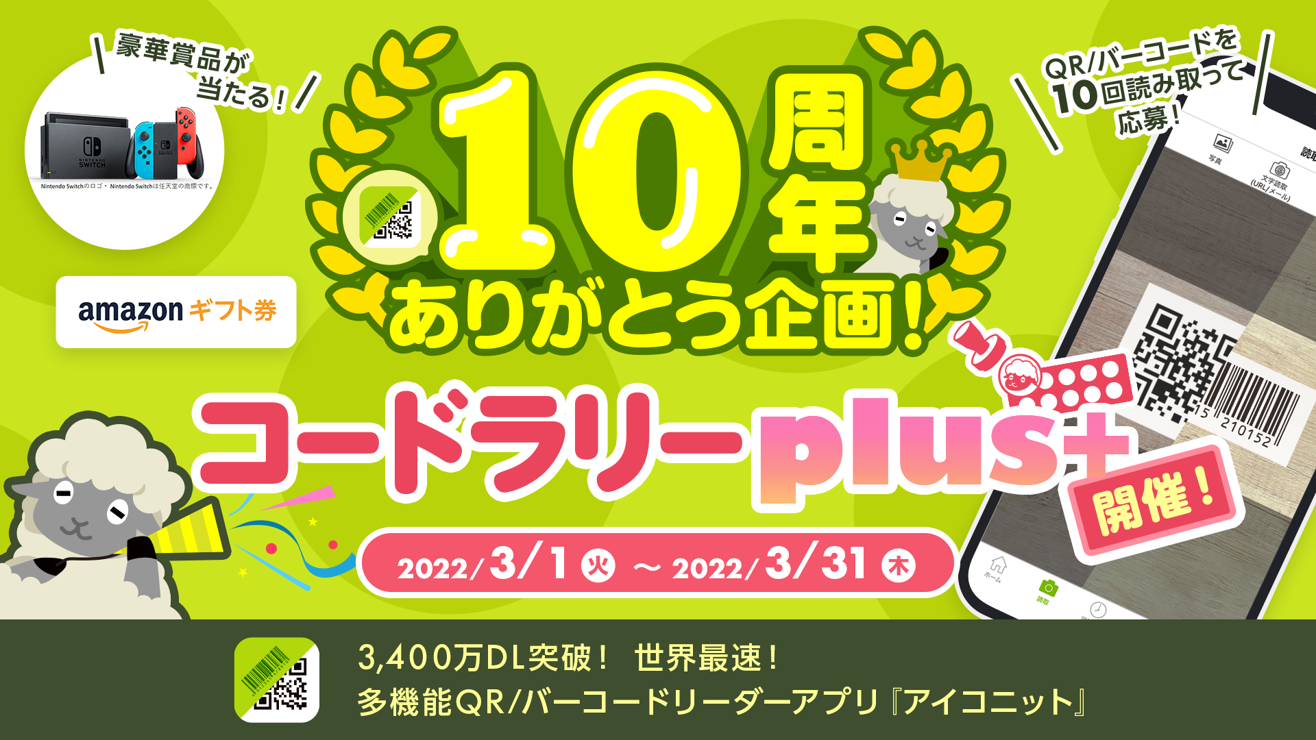 累計3,400万ダウンロードのバーコードリーダーアプリ「アイコニット」が誕生から10周年! ありがとうの気持ちを込めて、豪華景品が当たる「コードラリーplus+」キャンペーンを2022年3月1日より開始!