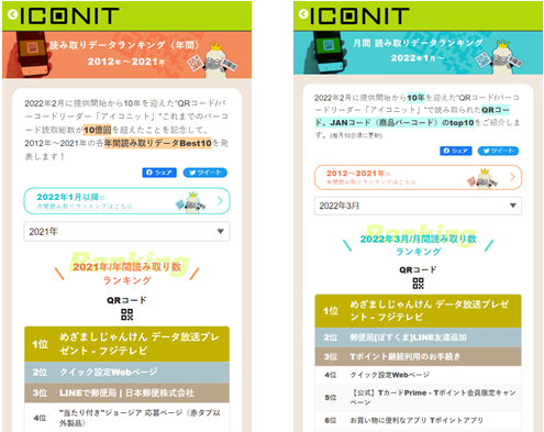 また、2022年1月~3月の「月間読み取りデータランキング」も同時に公開。今後は月間ランキングを毎月更新してまいります。更新情報は「アイコニット」公式ホームページ、SNSアカウント(twitter、facebook、instagram、Tiktok)よりご確認ください。