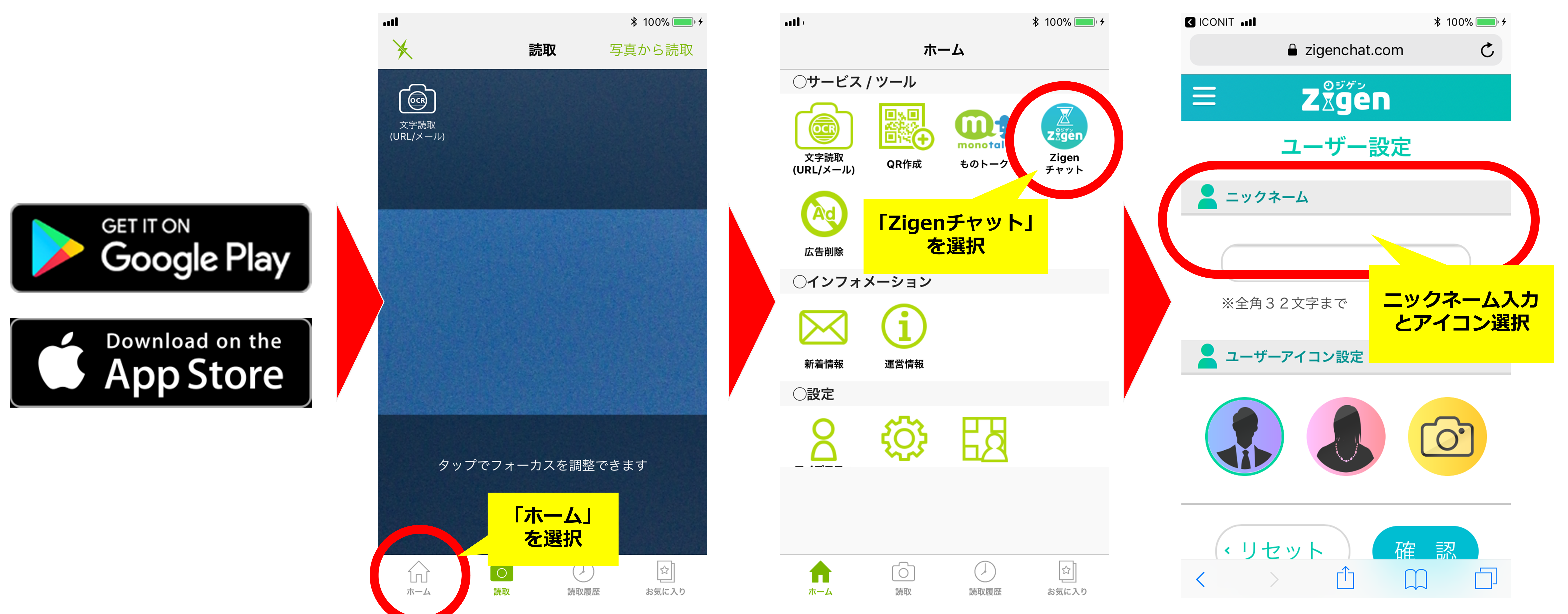 (3) 「Zigen」ユーザー設定(ニックネームとアイコン登録)の後、すぐ利用開始できます。