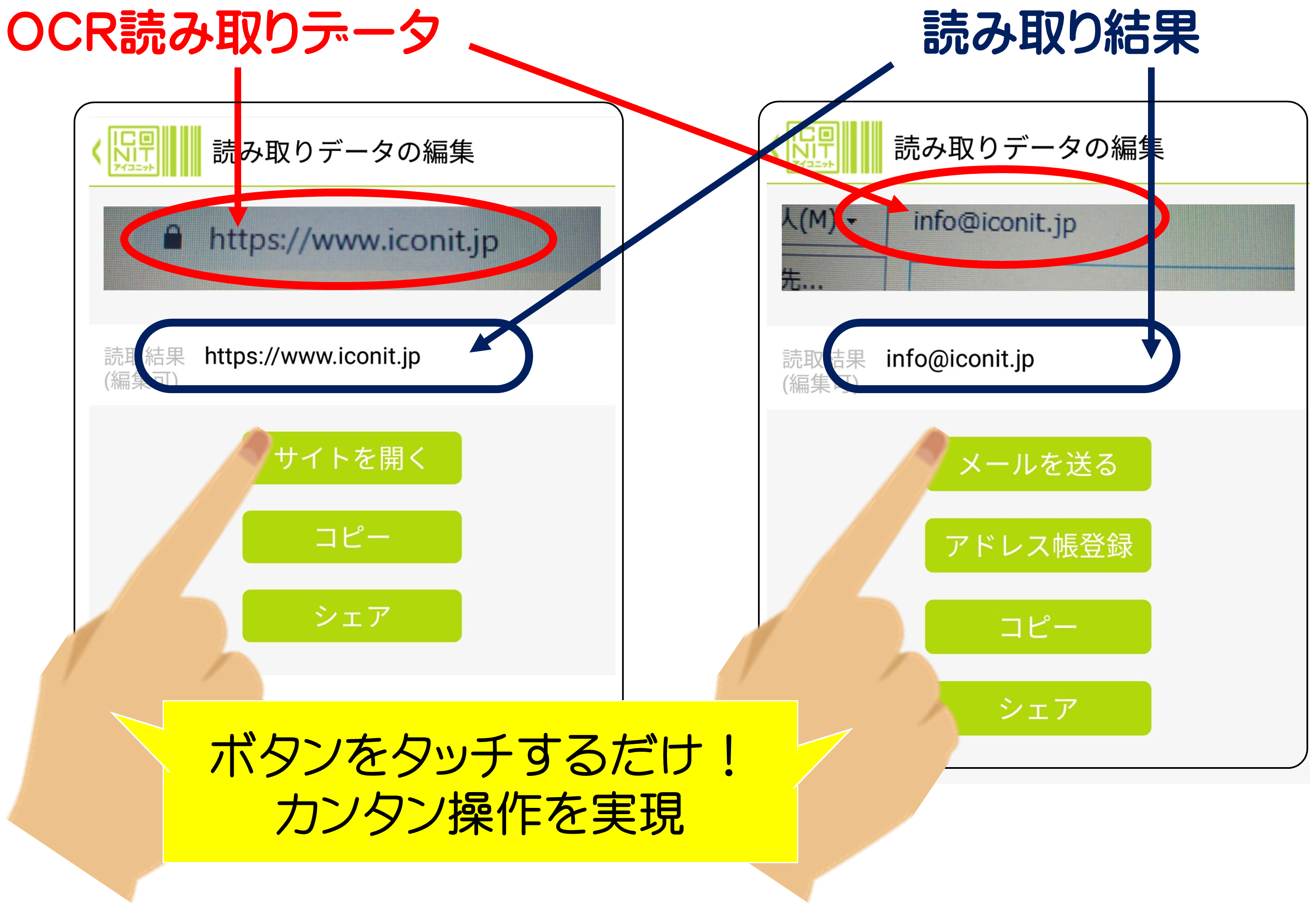 最新バージョン(バージョン4.7.4)では、Android版にOCR読み取り(文字読み取り)機能を追加。「アイコニット」の専用画面からURLやメールアドレスをスキャン(文字読み取り)するだけで読み取り結果画面からワンタッチでサイトにアクセスしたりメールを送信できるようになりました。iOS版ではバージョン4.6.0 からOCR読み取り機能を搭載していましたが、今回のバージョンアップで読み取り性能が更にアップしました。