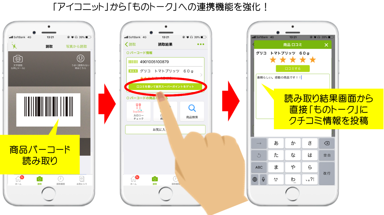 最新バージョン(バージョン4.7.5)では、商品バーコード(JANコード)の読み取り結果画面を改良。商品のクチコミ情報をチェックできるクチコミ投稿サイト「ものトーク」との連携機能を強化しました。最新の「アイコニット」から商品パッケージに印刷されたバーコードを読み取るだけで、商品のオススメ度を表す「☆」の数とレビューの数を確認できるようになりました。あわせて、最新バージョンでは、「アイコニット」のバーコード読み取り結果画面から直接「ものトーク」へクチコミ情報の投稿やオススメ度の「☆」を投稿できる機能を追加しました。