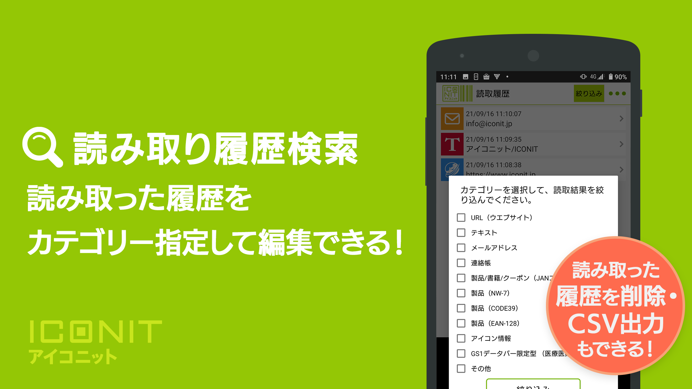 株式会社メディアシーク(本社:東京都港区、代表:西尾直紀)が提供するスマートフォン向け高付加価値バーコード読み取りアプリ「バーコードリーダー/アイコニットTM」(以下「アイコニット」)に、読み取り履歴のCSVエクスポート機能および、コード種別ごとに読み取り履歴をワンタップで絞り込める機能が追加されました。