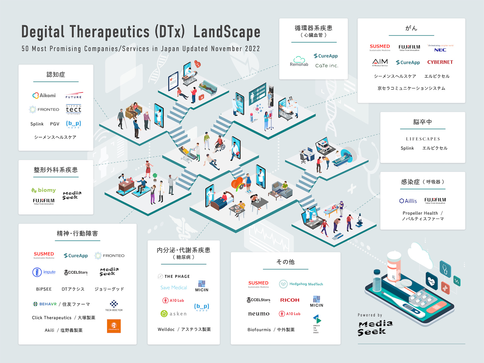 デジタル医療とも呼ばれる“DTx(デジタルセラピューティクス)”関連事業を推進している株式会社メディアシーク(本社:東京都港区、代表:西尾直紀、以下「メディアシーク」)は、「DTx カオスマップ2022」を作成し、2022年12月6日に公開しました。