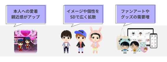 アーティストオリジナルのSDキャラクター(ちびキャラ)を開発し、新しいファンの獲得や既存ファンのロイヤルティ向上につなげます。可愛いキャラクターでアーティストのイメージを拡散しましょう。