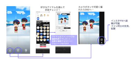「Fankuru」はファンクラブサイトの基本機能(お知らせ、アーティストプロフィール、ムービー、画像、グッズ販売、月額課金、会員管理)の他に、SDキャラクター(スーパーデフォルメキャラクター。ちびキャラ、ミニキャラとも言われる)の提供が可能です。育成ゲーム感覚で毎日利用していただくことで、ファンの推し愛をさらに促進します。