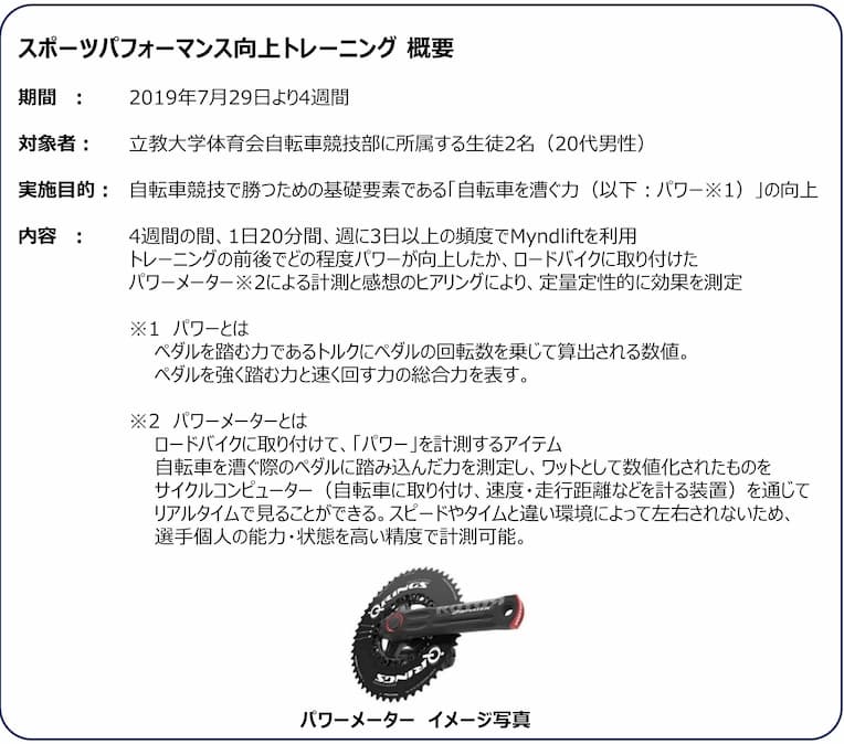 株式会社メディアシーク(本社:東京都港区 代表:西尾直紀)は、ブレインテック(注1)を応用した、ゲーム感覚でスポーツパフォーマンス向上トレーニングができるアプリMyndlift(注2)を、2019年7月29日から立教大学体育会自転車競技部(所在地:東京都豊島区西池袋3-34-1)にテスト導入いたしました。