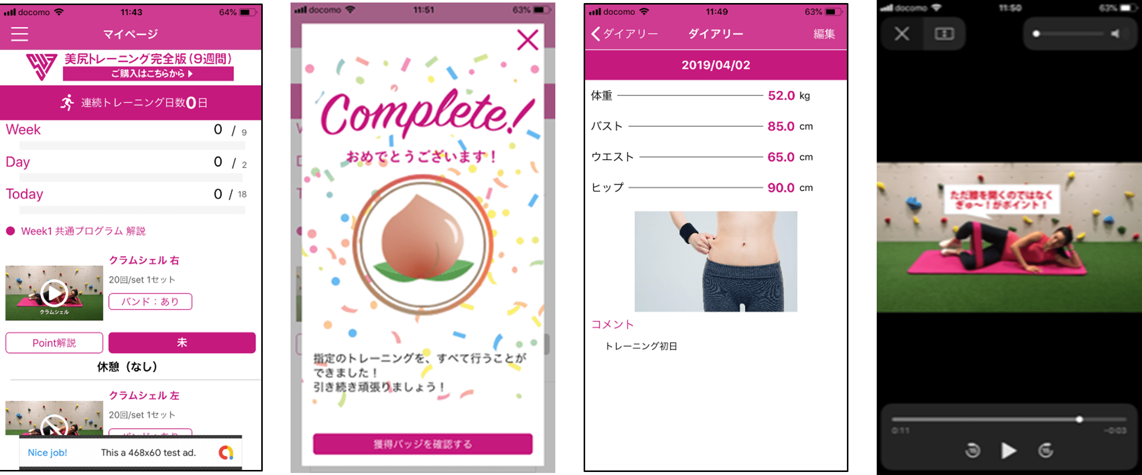「美尻サロン」アプリは全9週間のコースとなっており、最初の1週間のトレーニングメニューは、無料で継続的に利用可能です(2週目以降のトレーニングメニューは別途購入が必要です)。豊富な種類のトレーニングはもちろん、メニューの組み方や順番、休憩の取り方にもこだわってプログラムを組みました。アプリに表示された通りに実施することで、しっかりとしたトレーニングメニューを行うことができます。すべてのトレーニングは岡部 友・本人が実演する動画の解説付き。トレーニングの履歴や、達成度により獲得できるバッジ、ボディサイズの記録管理、Before/After比較用の写真合成など、補助機能も充実しています。